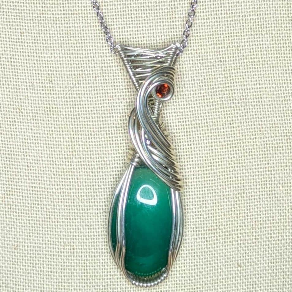 Green Onyx & Garnet Pendant | Sterling Silver - Wire Wrapped Handmade Jewelry | Natural Crystal | Boho | 20 inch stainless steel chain included